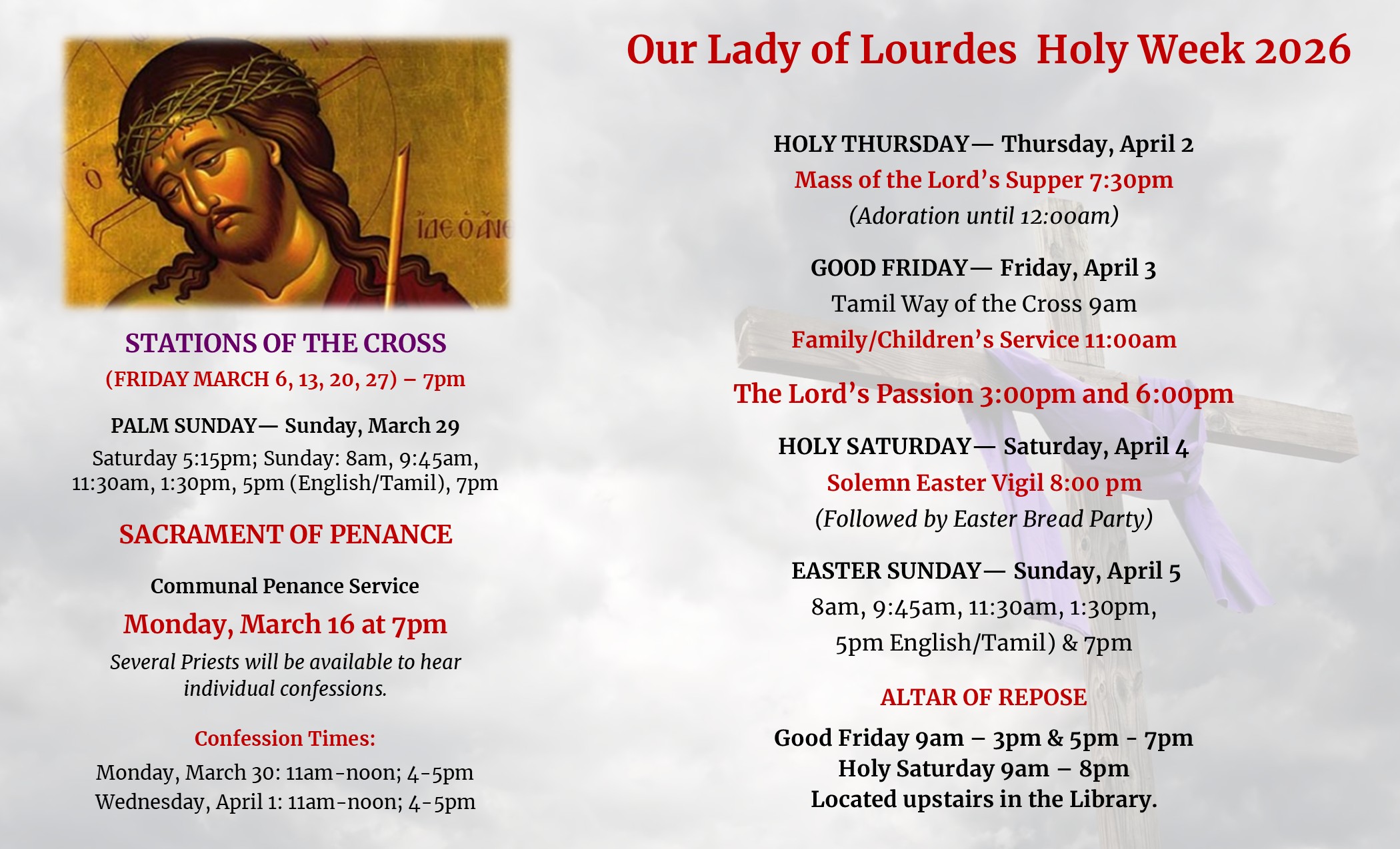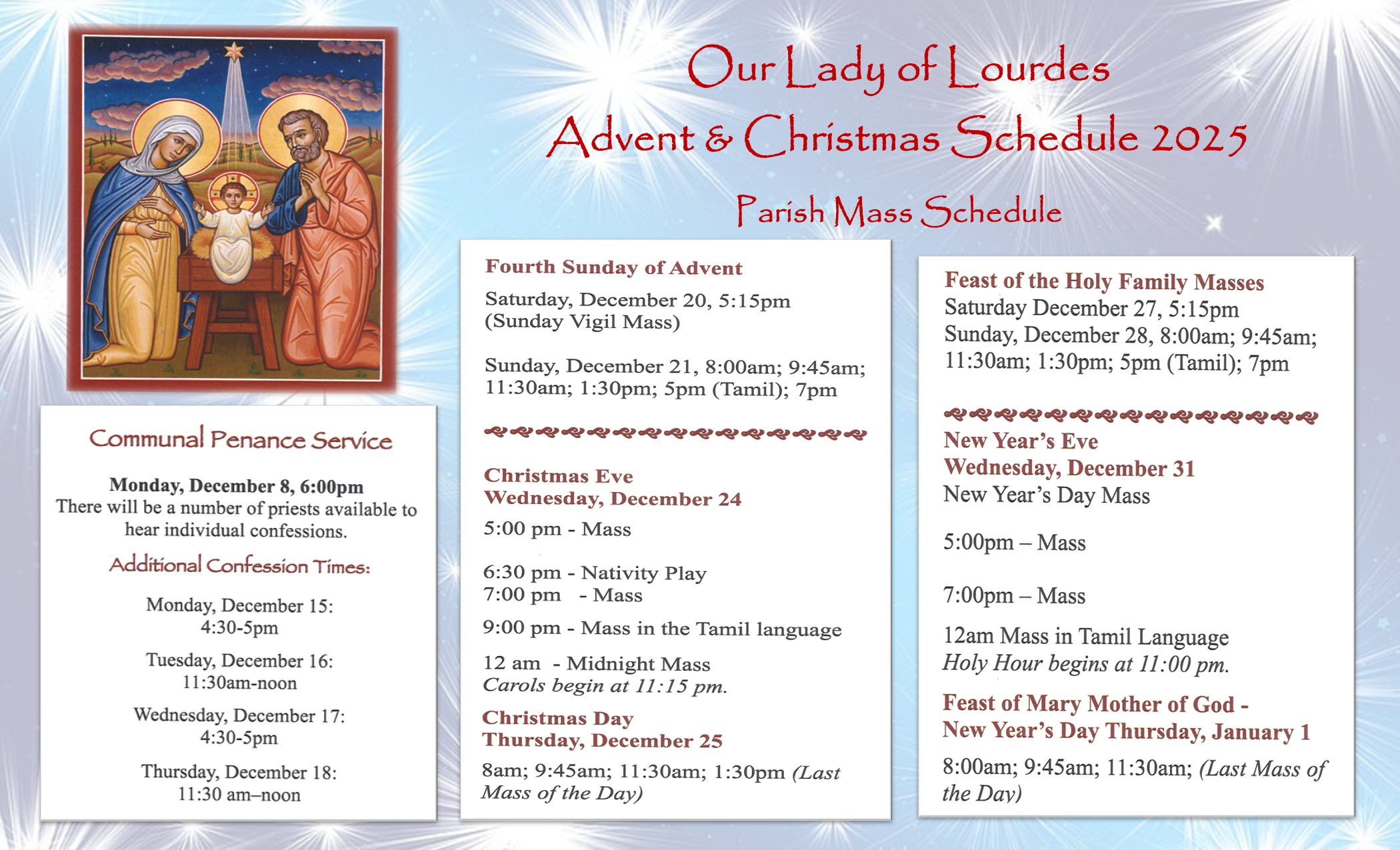 8am, 9:45am, 11:30am, 1:30pm 5pm (English/Tamil) & 7pm
