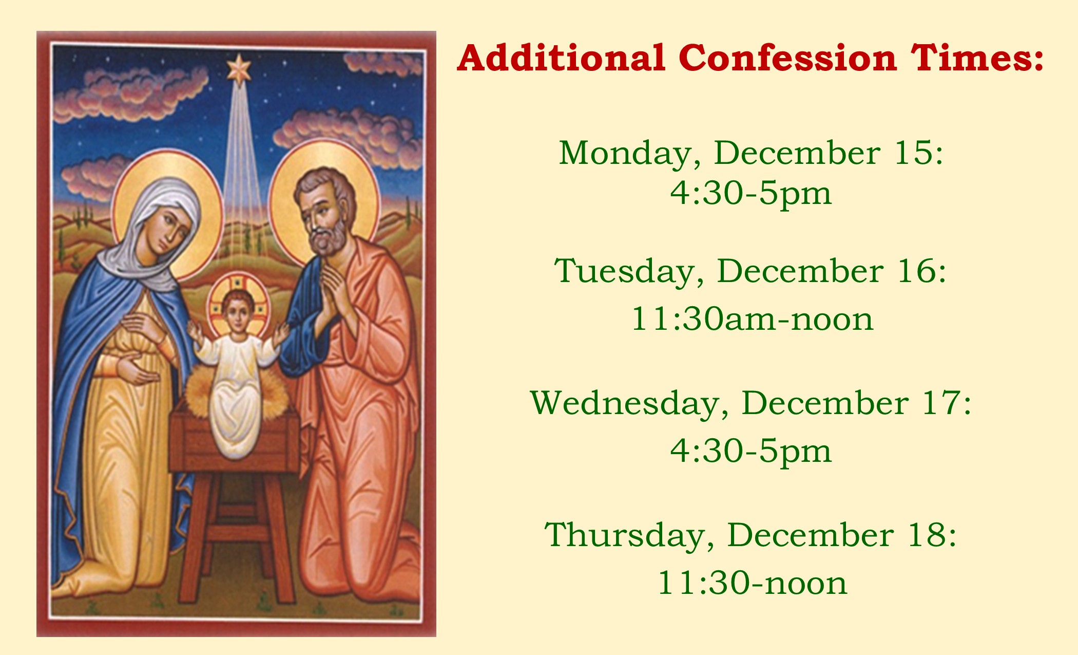 11am to 12noon & 4:00 pm to 5:00pm in the church